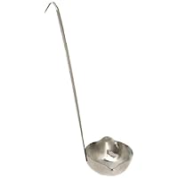 I know it's weird to review a ladle, but this is the best ever. I bought one that was hard plastic, but the coating was coming off in my stock, ew. I bought another one that had a metal scoop and plastic handle, that came apart. This is the best because it is solidly made, all metal, and the handle is long enough to hook on a large pot I have a 3 gallon that is tall and a 5 gallon that is even bigger. This ladle doesn't sink into your soup/sauce/stock, etc. If this ever gives out, I will definitely buy another one, but I think it will be a very long time before I need one.