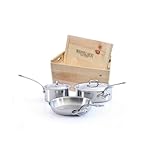 Just received this set as a housewarming gift from my (supremely generous!) parents, who clearly wanted me to get the best use of the kitchen in my newly purchased home. Mauviel is, to many, the finest name in cookware, and often synonymous with copper pots and pans. Rest assured their 5-ply stainless steel items are of the same quality for which they've become famous. This is the perfect starter set, with a small sauce pot, frying pan and sauté pan. They are sturdy and quite heavy; they feel good in the hands. The handles curve upward where they are riveted to the pot, which is a nice feature and keeps your hands a bit further from the flame. The lids are nice and heavy as well, and fit perfectly the same lid fits both the sauté pan and the frying pan. Although they could probably be considered somewhat "pricey," they seem to be built to last for years decades, even. This makes them a very good buy; instead of spending $100 every five years or so, spend $500 and never have to buy cookware again.