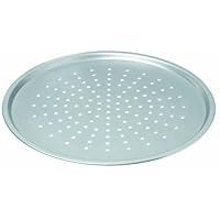 The Chicago Metallic Pizza Crisper is a commercial-grade sheet metal pan that's perforated with 1/4" holes across its surface. The holes provide air circulation that helps cook a pizza crust evenly from center to edge. Without this ventilation if you use a standard cookie sheet, for example your pizza crust will cook crisp on the edge but remain underdone in the center.A more common way to evenly bake a pizza crust is with a porous baking stone, such as 1 2 or 3. These will produce excellent results, but are more difficult to manage in the kitchen than a crisper pan. In particular, after building your pizza it can be tricky to transfer it to a preheated stone. Removing the pizza after it's cooked can also be difficult. The best answer for working with baking stones is to use a peel, such as 1 or 2, for inserting and removing pizzas from the oven. The downside for many kitchens is storage where do you put the inch-thick stone and unwieldy peel? And that's after you let the stone cool so it can be washed.