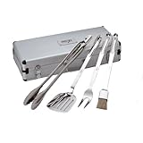 Like many poorly made items, this comes in a nice case. The case is the nicest thing about the set as the brush does not work well and is difficult to clean (synthetics or mops are better). The tongs must be locked and unlocked with 2 hands. The tines on the fork flatten out to destroy any piece of meat you pick up with them. The spatula, not thin and flexible. This set is a crime against both your wallet and cooking.