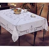 I searched high and low to find the right white lace vinyl tablecloth. This was the best one I found, and I have not been disappointed. Most of the other ones I saw had actual holes in the openwork lace cutout areas, which seemed to me to defeat the purpose of having a vinyl one (I needed a solid vinyl cloth to protect my antique table from my kids' spills). And the solid, thick, flannel-backed vinyl ones available everywhere were all too small for my long dining table and too bright and casual for my formal, traditional dining room (I don't have an eat-in kitchen to feed my small children on so I must use the "nice" dining room all the time and I didn't want to have to wash a fabric tablecloth every single day). I finally found this one, which has clear vinyl backing over the cutout areas of the lace pattern. I do wish it could have been thicker, like the flannel-backed vinyl tablecloths that were too small and informal for me, but then I realize it could not have the open-look lace style, so I guess those don't exist. The only way to get a vinyl lace one is for it to be relatively thin, with no flannel backing, but this one seems quite sturdy, and has stood up to daily use and wiping so far. (Reviews about some similar ones I had considered said they were too thin, almost like the disposable party-store tablecovers, and ripped after the first use! This one seems much better.) Be careful about oily or greasy food, though, because there appears to be a grease stain that won't wipe up, but it isn't too noticeable. The fold marks never completely go away, but I'm used to seeing fold marks on cloth tablecloths too so it isn't a big deal to me. It IS kind of thin with a slightly sheer look when the sun shines in, so you will see a bit of the brown of the wooden table underneath it (probably like you would if it were delicate real fabric lace too). I tried it with a plain white cheap fabric tablecloth underneath and it gives a completely different look the solid part of the white is a more solid and brighter white, the openwork lace pattern much less noticeable because white shows through the clear-vinyl-backed openings, not dark brown table. So that is an option, too, if the thinness bothers you. This cloth protects my table well from food, moisture and spills, but I don't imagine it will protect it from scratches (we have a cat) or heat, so I might keep the white cotton one underneath for long-term use (still easy-care because I can just wipe the top vinyl one clean). Overall I am pleased, but I would have been super-pleased if I could have found a thicker, flannel-backed white or off-white vinyl tablecloth that was long enough and elegant enough for a formal dining room. But those don't seem to exist! Also, customer service was superb quick response to my questions about the product and fast shipping. The customer service wasn't Amazon directly, it was the company who sold the tablecloth via Amazon.com, but I don't know the name offhand.