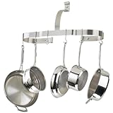 Among pot racks, some hang from the ceiling and others mount on the wall. This Cuisinart Oval Rack mounts on the wall and is exactly what I wanted since I'm still apartment-living (I don't have a big kitchen). In other words, it's a great space saver and fits almost anywhere. I've hung it over my stove once, and now have over my sink. The rack is made of solid stainless steel and is strong enough to hold any pot, so long as it is mounted properly. Make sure it is mounted into the studs inside the wall. So, installing it can be tricky if you're not familiar with a drill and stud-finder. The one problem is that the unit has three predetermined holes for mounting and you'll be lucky if two holes match the location of the studs. I'm extra cautious (and I live in earthquake country) so I mount to a solid somewhat longer peice of wood, then mount that wood to the wall. The unit comes in two pieces and is shiny and sleek. It gives a "Gourmet Cook" impression. It comes with five or six pot hooks (I can't remember) but that's plenty giving the overall size of the unit. I would buy it again.