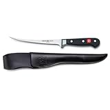 I am dating a chef at a fine dining seafood and steak restaurant and he had mentioned that he needed a fillet knife so I got on line and with the help of these great reviews I chose this one. He was very surprised and happy when it shipped to the restaurant. He said that I could not have done any better, that guys he has worked with would try and carve their knifes to look like this one. It is a very sexy knife and gets right under the skin. Anyway, one of the servers comes in the kitchen, sees the knife and runs his finger down the blade lightly to test the sharpness and it nearly cut his finger off. All the way into the bone! Yes he had to get stitches. Thus comes my title, this knife is for big boys only. It is sharp! My chef loves it!