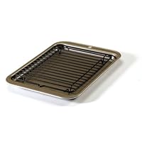 The rack doesn't fit into any type of a groove & when food sticks, which it does, the whole rack comes off. You are constantly having to hold the rack with a pot holder to flip or remove food. It began to chip & flake after a few months and we tossed it in the garbage. Not recommended.Honest reviews on Nordic Ware Toaster Oven 2-Piece Broiler Set