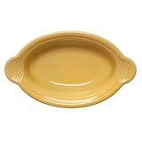 While this casserole matches beautifully with previously purchased Fiestware, I was somewhat dissapointed in the overall size. I expected it to be larger. I found this also to be true with the previously purchased small casserole dish. I kept it because it is a nice dish however, I will check the overall size much closer next time. It arrived, packaged well and in good shape.